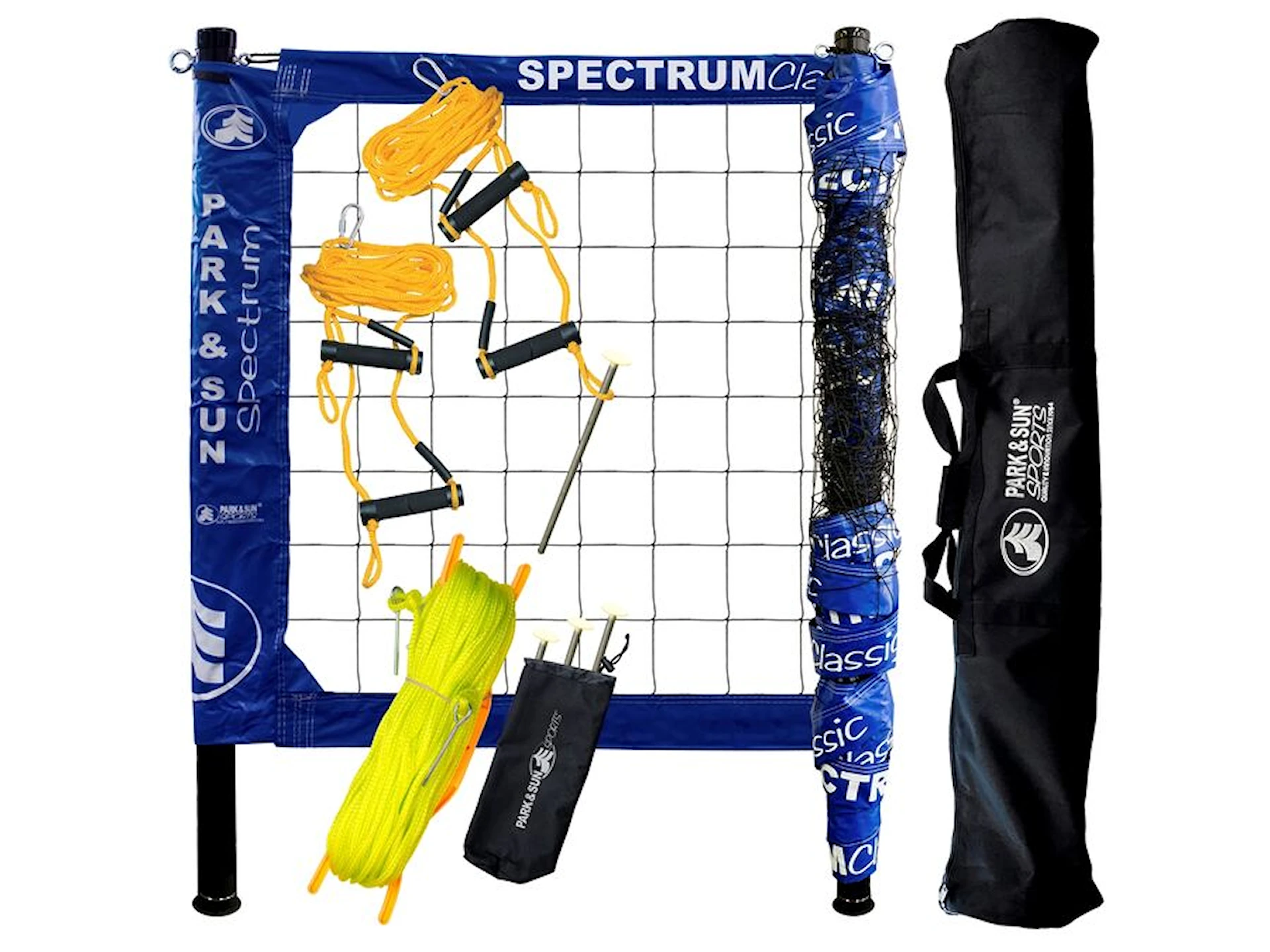 De inkluderede barduner og jordankre sørger for, at nettet forbliver stabilt, selv under intensivt spil. Nettets spænding justeres hurtigt med et polstret spændingssystem, der holder nettet stramt fra top til bund. Sættet indeholder også en præmålt banemarkering på 18 x 9 meter, som fastgøres til underlaget med hjørneankre.