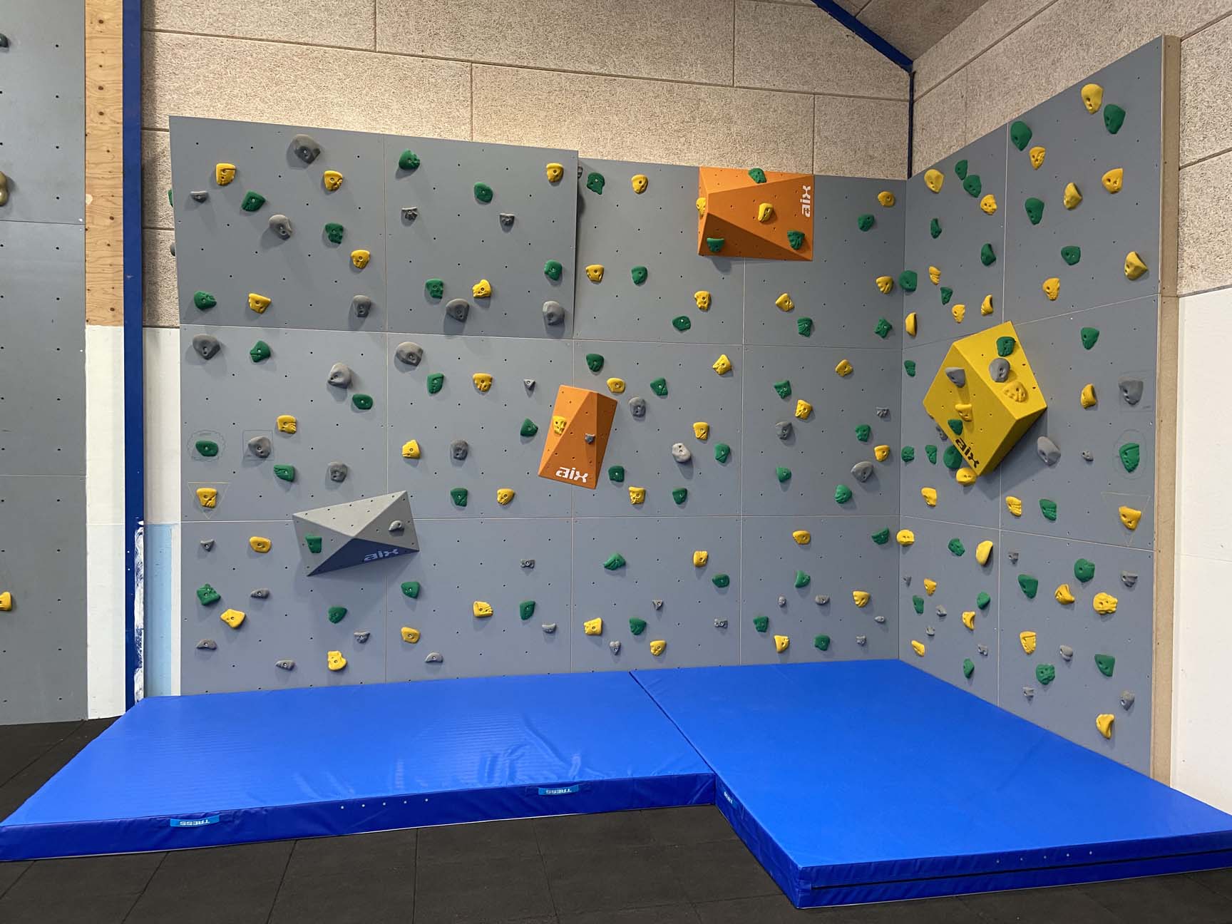 På de nye klatrevægge kan man udfordre sig selv og følge enten den grå, den grønne eller den gule rute. Hvis man er mere til boldspil, er der også rig mulighed for dette i hallen, der med spærrenet er opdelt i forskellige zoner.