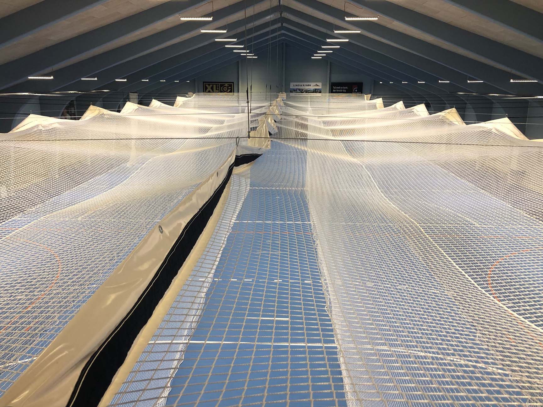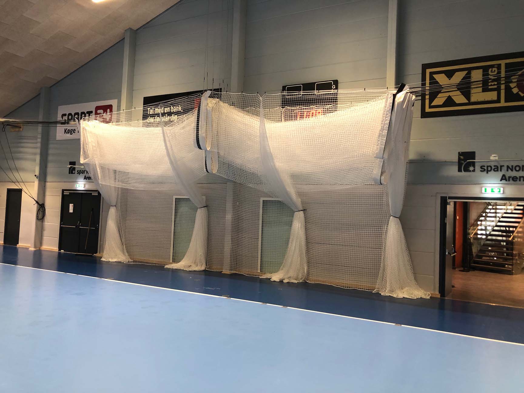 Kastegårdene kan nemt og enkelt rulles sammen og bindes fast i den ene ende af hallen, når de ikke bruges – og er således ikke i vejen for de andre sportsgrene.