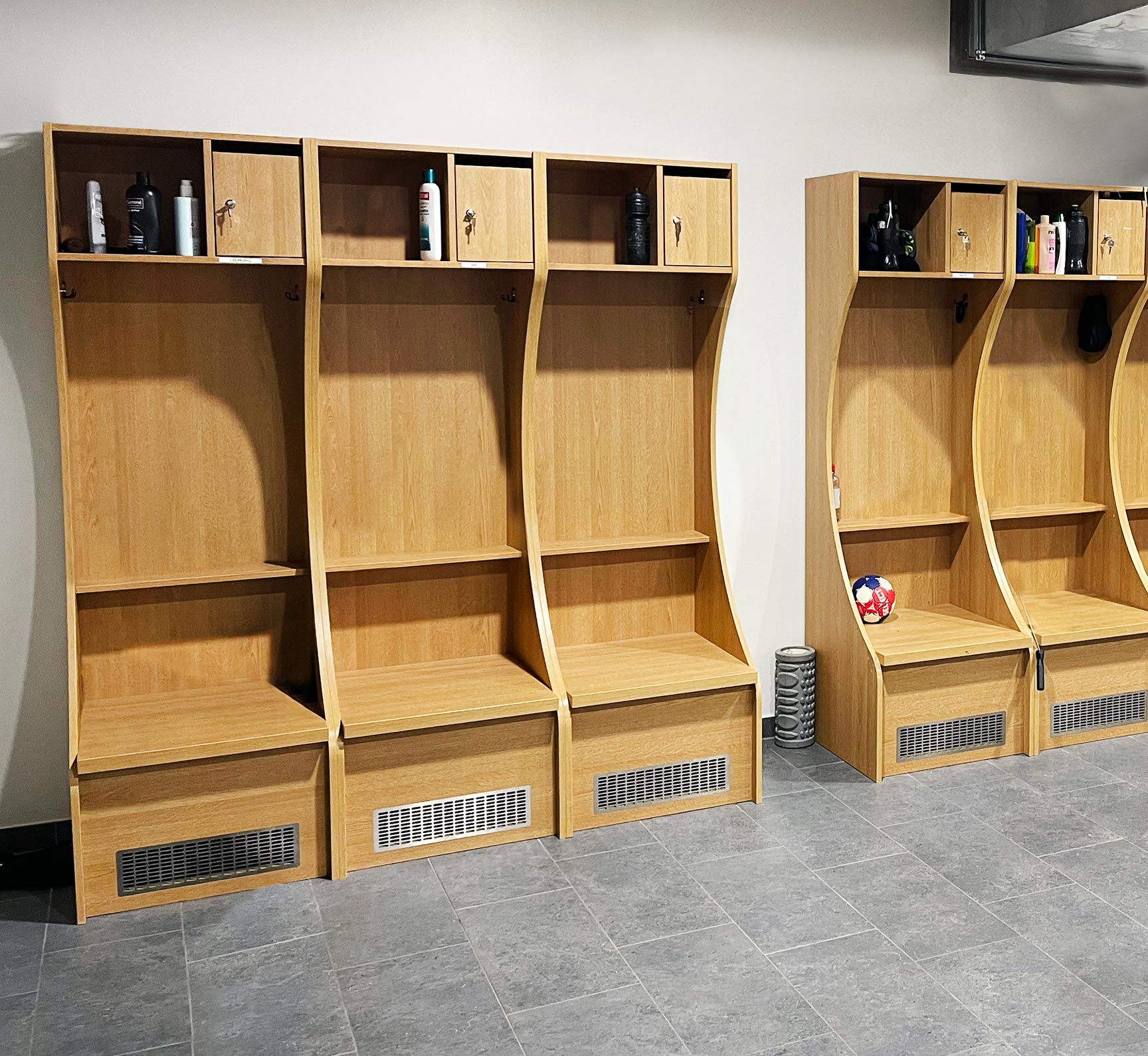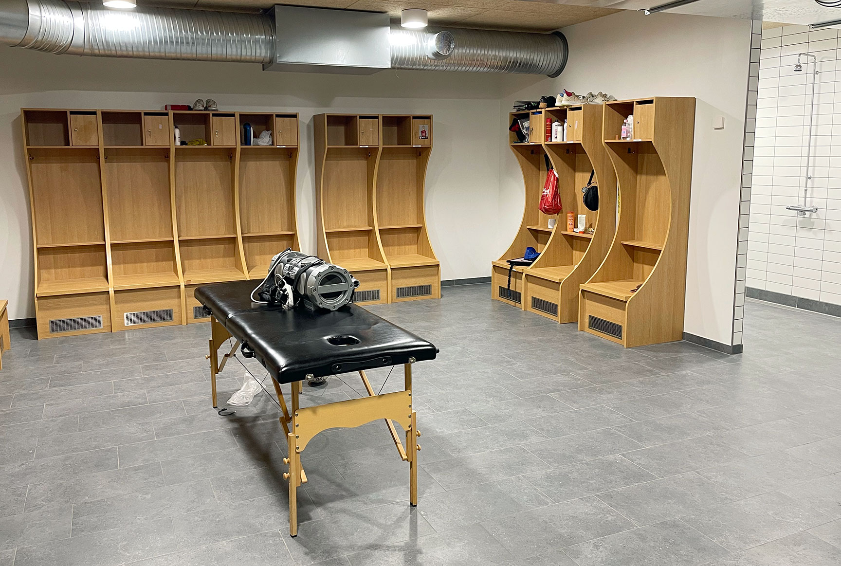 Hver spiller har fået sin egen omklædningsboks med god plads til både taske, sko og overtøj. Alle omklædningsbokse har desuden et rum til værdigenstande, som kan aflåses.