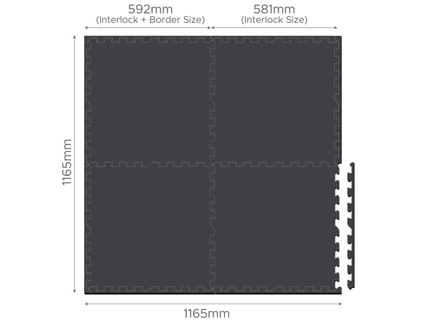 Hver matte måler 59,2 x 58,1 cm og totalt måler settet 116,5 x 116,5 cm. Tykkelse 10-11 mm.