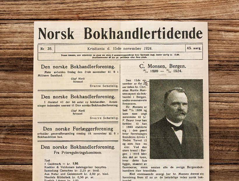 Dagen da 31 år gamle Christen Monsen startet sin egen bokhandler under navnet C. Monsen Bok & Papirhandel, i leide lokaler på Torget i Bergen.