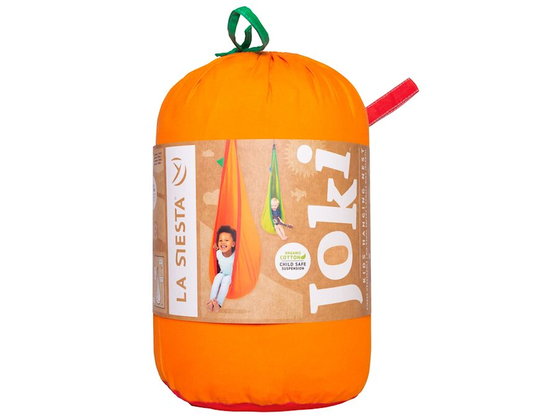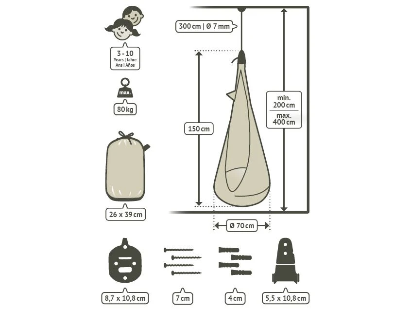 Upphängningslösningen är mycket smart och gör det enkelt att hänga upp och ta ner kojan, samt att justera höjden över golvet. Med en säkerhetssvivel undviker du att hängkojan snurrar ihop när barnen snurrar runt. Lösningen är testad enligt TÜV och uppfyller de högsta säkerhetsstandarderna.