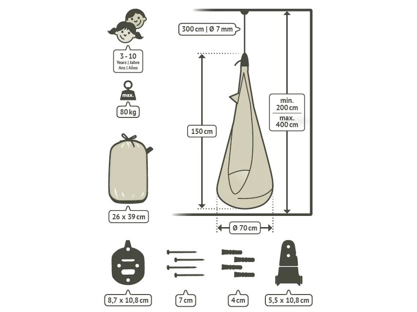 Hängkojan är tillverkad av 100 % ekologisk bomull av hög kvalitet med en bärkapacitet på 80 kg. Den levereras med integrerat upphängningsfäste. Kudden har en sittbredd på 70 cm och är tillverkad av polyester. Den kan tas ut och upphängningen kan också tas bort, vilket gör att alla delar kan tvättas.