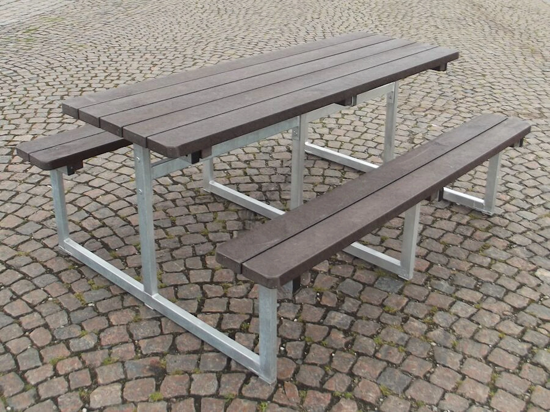 De massiva plankorna i genomfärgad plast är 100 % underhållsfria, tål alla slags väder och har en fin träliknande struktur. Plankorna är vattenavvisande, extremt robusta och helt splitterfria. Bänkbordet kan levereras i färgerna grå, brun, grön eller svart, där grå är standard.