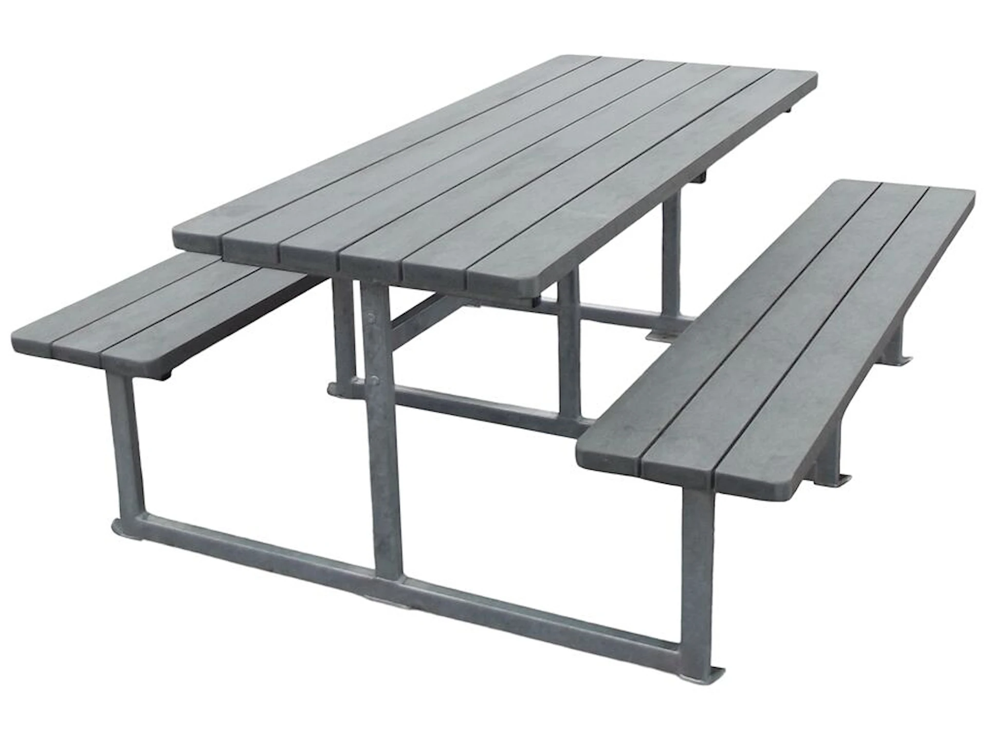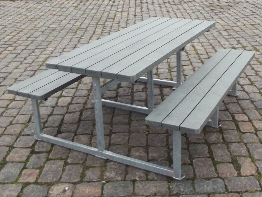 De massiva plankorna i genomfärgad plast är 100 % underhållsfria, tål alla slags väder och har en fin träliknande struktur. Plankorna mäter 120 x 40 mm, har rundade hörn och är vattenavvisande, extremt robusta och helt splitterfria. Bänkbordet kan levereras i färgerna grå, brun, grön eller svart, där grå är standard.