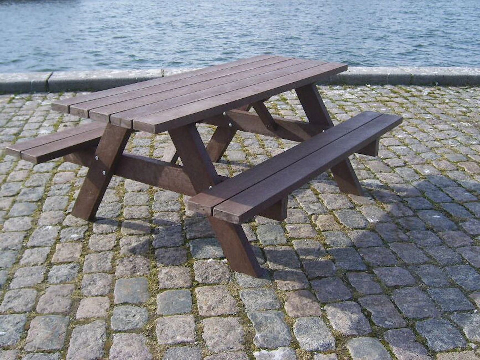 Plankorna har rundade hörn och är vattenavvisande, extremt robusta och helt splitterfria. Bänkbordet finns i färgerna grått, brunt och svart, där grått är standard. Välj den färg som passar bäst in i din omgivning. Bänkbordet är fristående men går även att förankra i marken.
