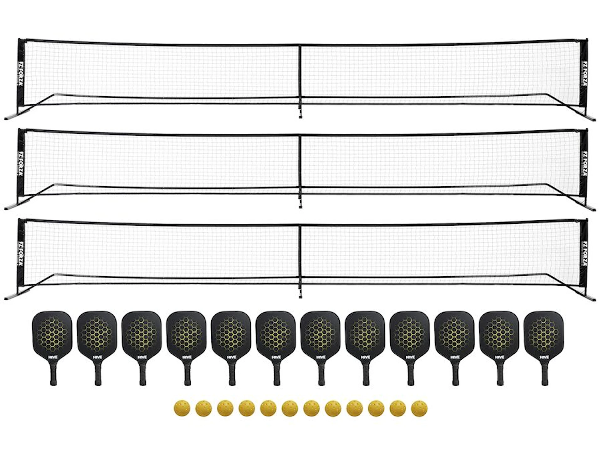 3 x FZ FORZA pickleball nätställningar som kan sättas upp på vilken plan yta som helst både utomhus och inne i idrottshallen.
