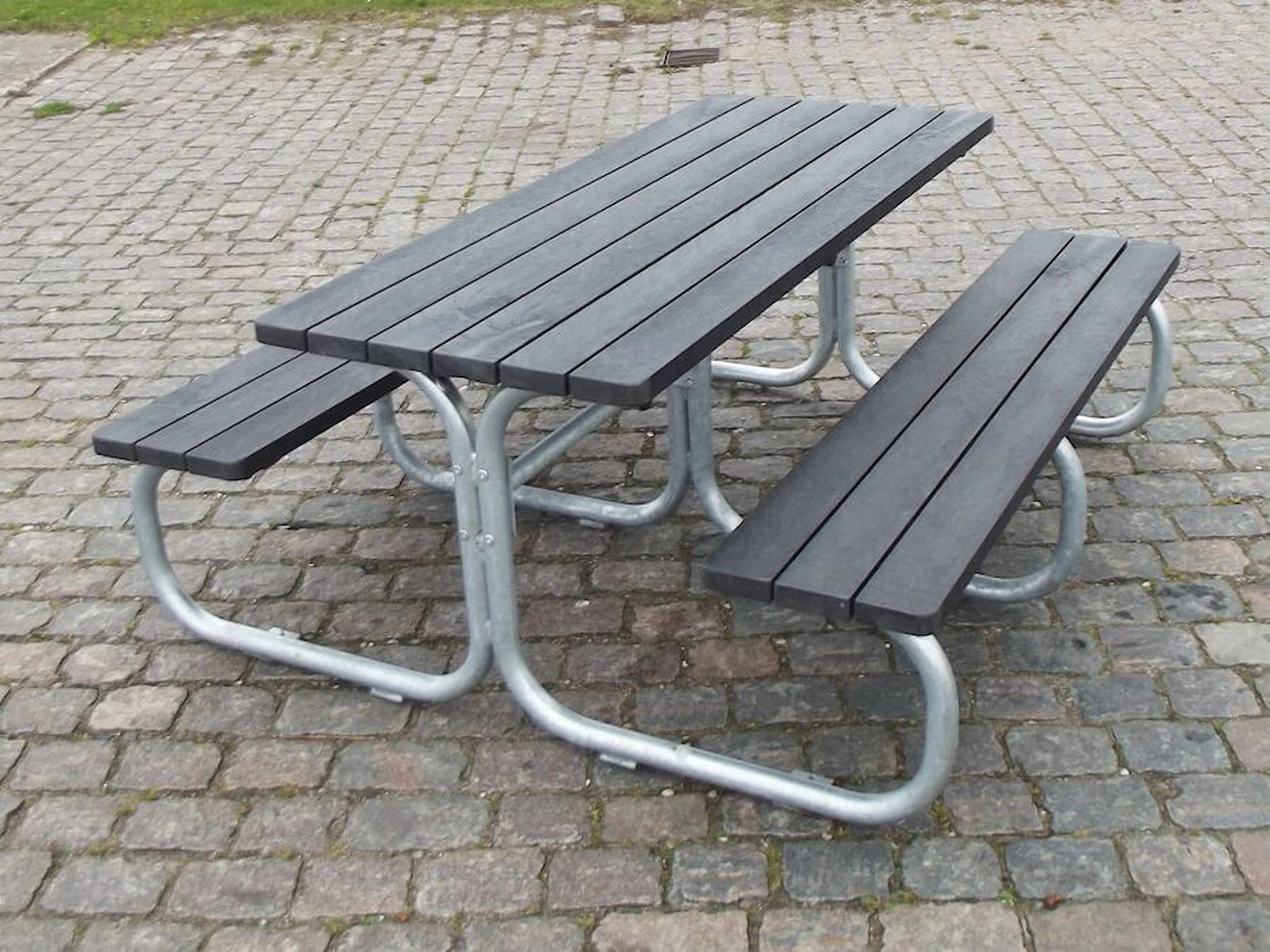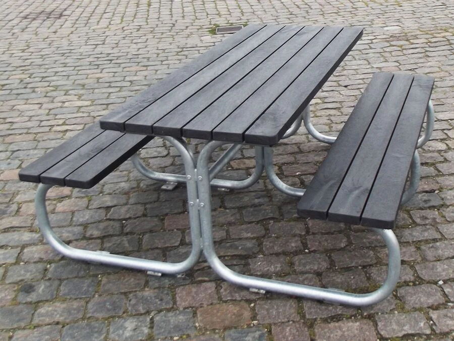 Detta bänkbord levereras som standard med grå plankor av återvunnen plast, men kan också levereras i svart, grön eller brun färg. Dansktillverkade kvalitetsmöbler till utemiljön.