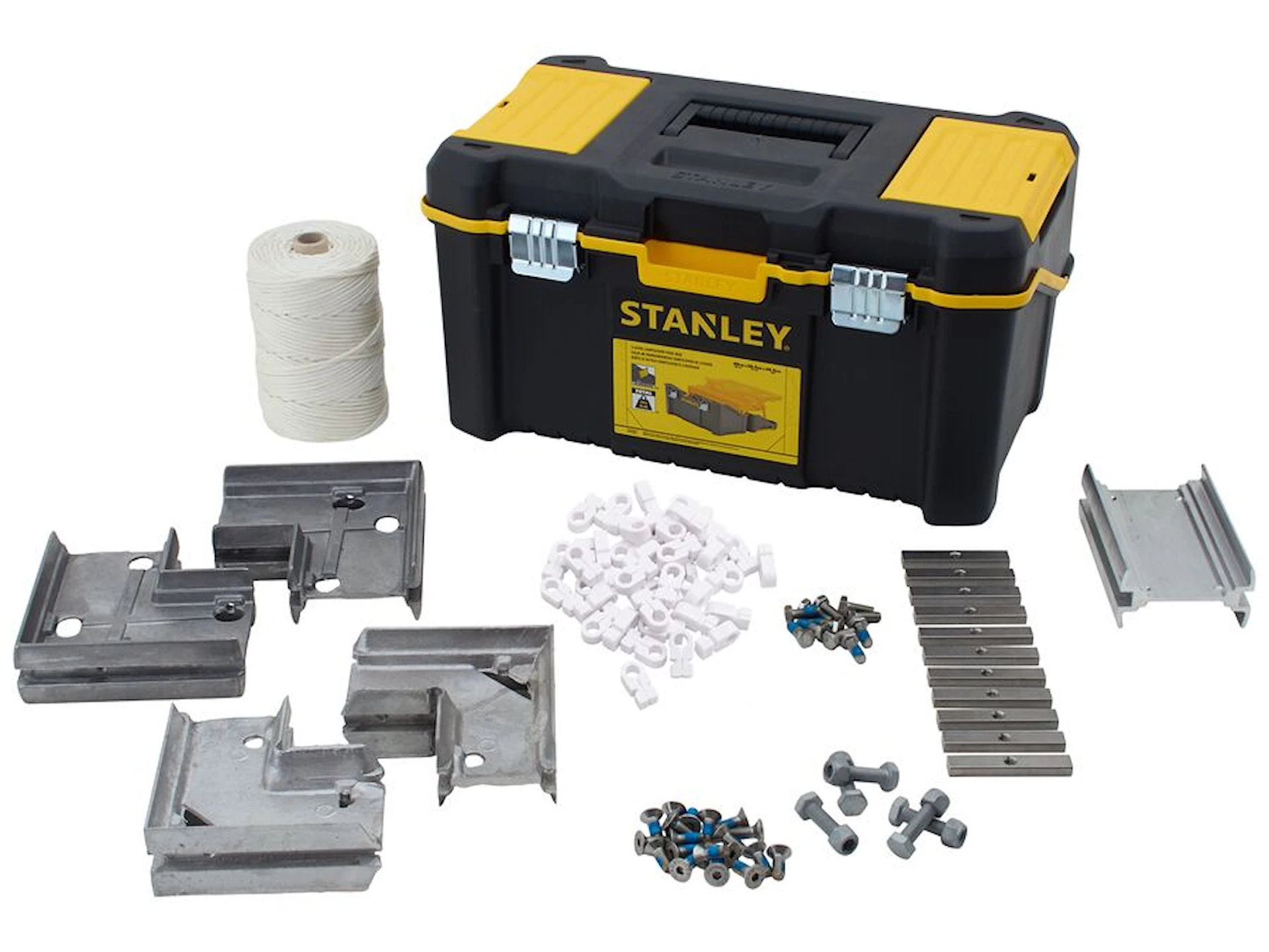 10 T-bultar, 60 nätkrokar av nylon, 5 hörnbeslag inklusive skruvar som passar flera olika 3, 5, 7, 9 och 11 mot 11 fotbollsmål, samt handbollsmål. 10 insexskruvar 8 x 20 mm för hörnmontage, 5 bultar till bakliggare, 5 låsmuttrar till bakliggare samt en rulle vitt snöre på 180 meter.